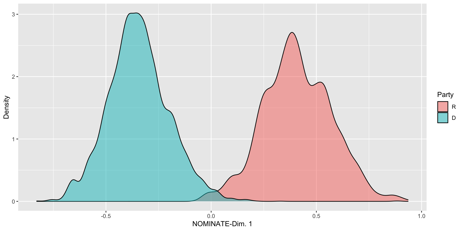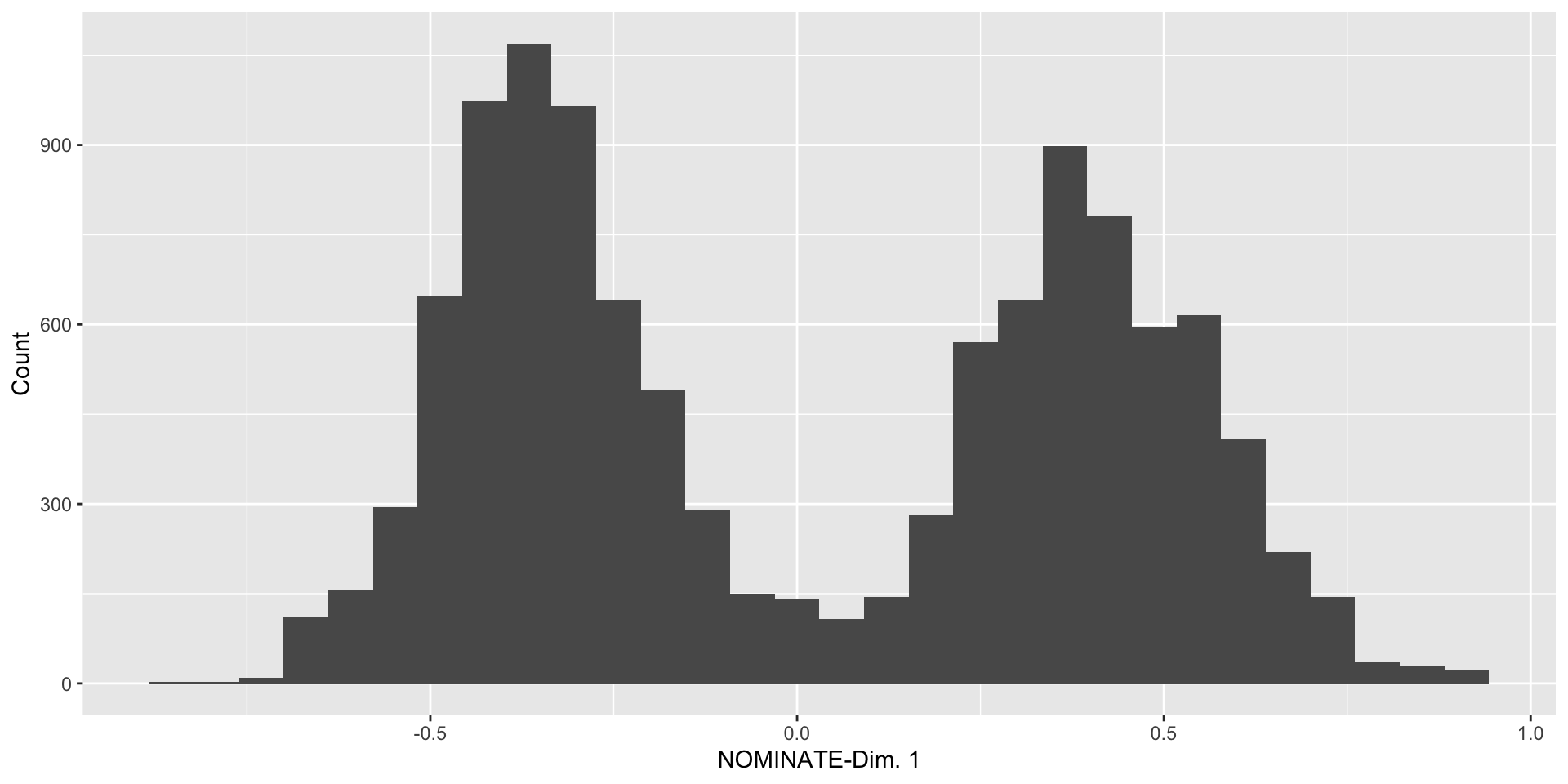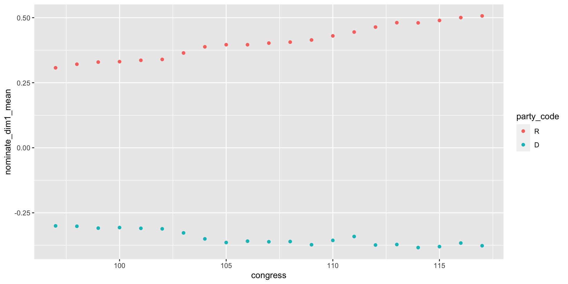 dplyr functionsdata tabDownload Dataparty_code variable, so it reads “D”, “R” instead of “100”, “200”party_code variable, so it reads “D”, “R” instead of “100”, “200”party_code variable, so it reads “D”, “R” instead of “100”, “200”nominate_dim1