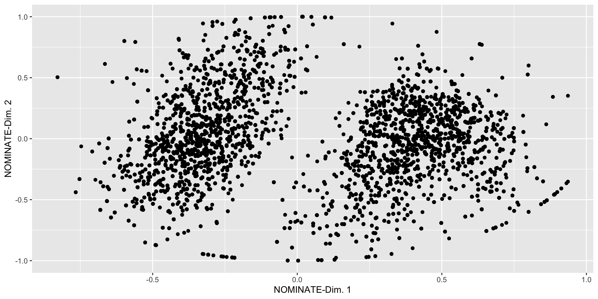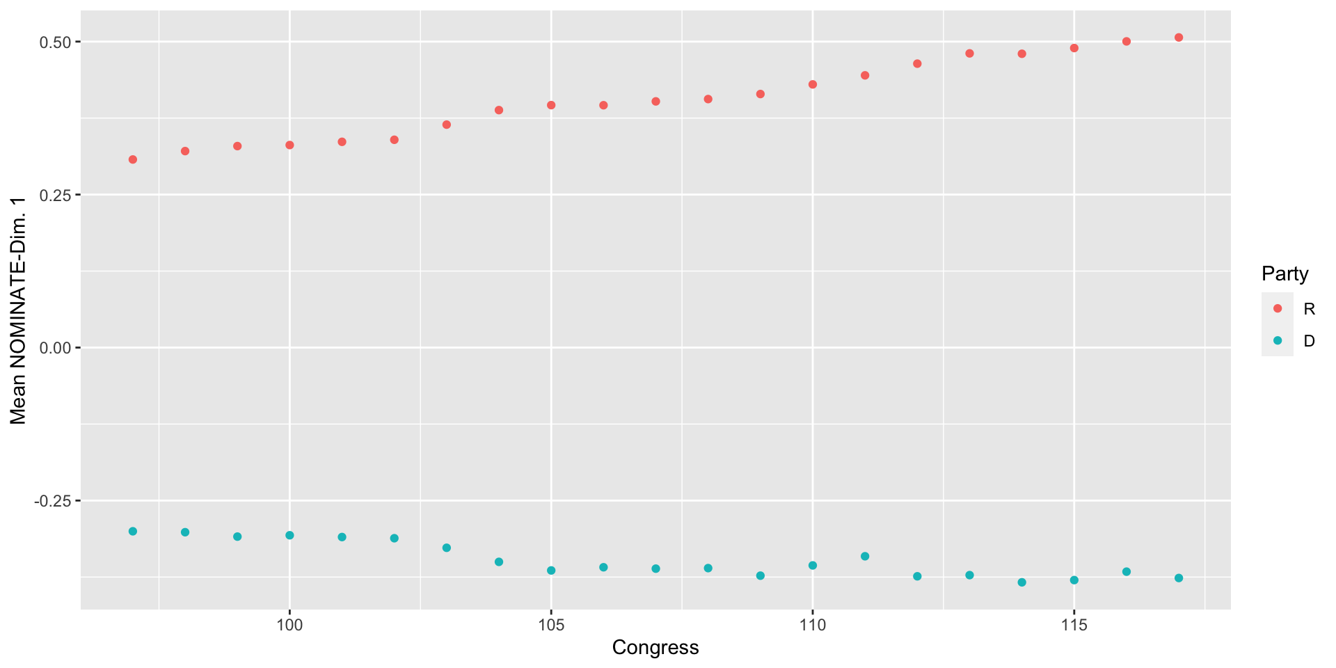modelsummary packagenominate_dim1 filled by partynominate_dim2 against nominate_dim1nominate_dim2 against nominate_dim1group_by() function in tidyverse to group our data by given variablessummarize() and desired function to create new function