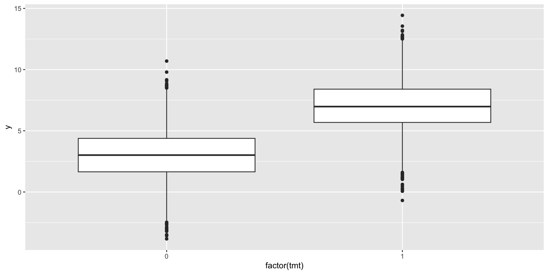 • True equation is \(y = 3 + 4*treatment + \varepsilon\)