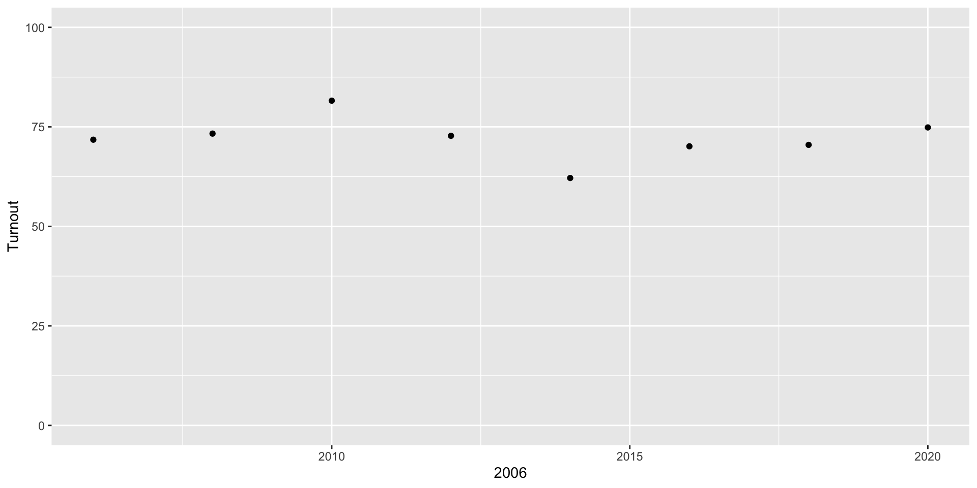 geom_point(aes(year, turnout, color = "True Turnout"))