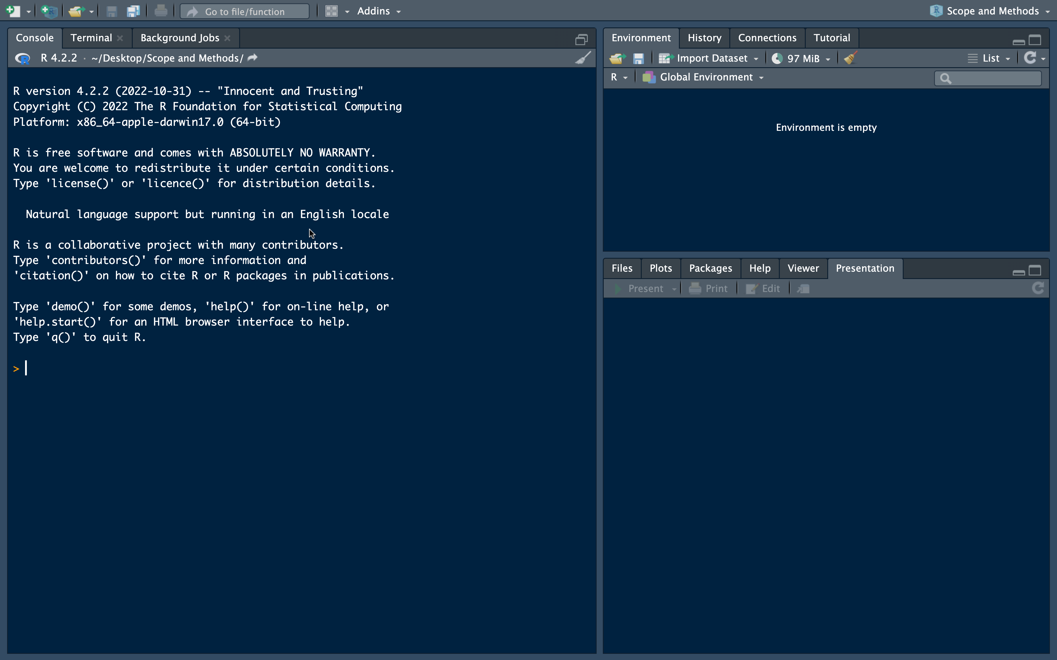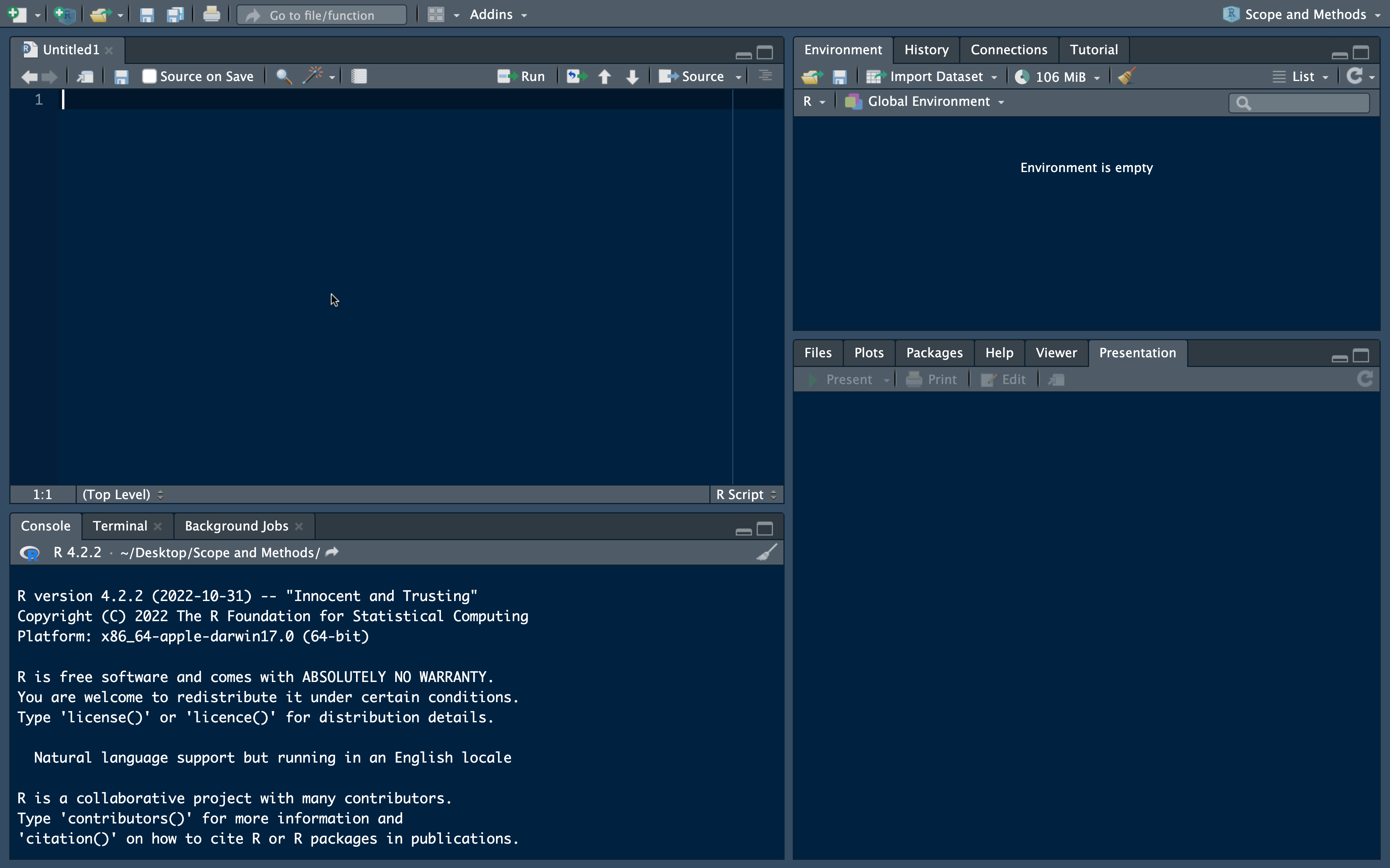 Bottom Left: Console (can run code–but this will not necessarily be as reproducible)